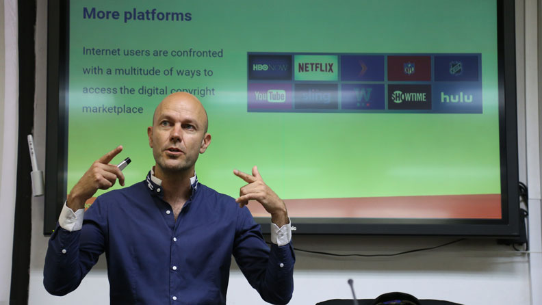 У фокусу скупа било је излагање др Седрика Манаре, директора Гугла за ауторско право, са којим је разговарао проф. др Душан В. Поповић, редовни професор Правног факултета. Др Седрик Манара је излагање започео освртом на историјску позадину питања заштите ауторског права и објаснио да је данас регулација ове области изузетно захтевна, услед чињенице да корисници са сваког дела планете путем великог броја платформи приступају истом садржају, док је ауторско право предмет локалних закона. Кључни изазов са којим се регулатива интелектуалне својине суочава на интернету је вишеструкост – мноштво платформи на којима је доступна невероватна количина садржаја који практично свако са паметним телефоном може да постави. Зато је важно знати да се у дигитализованом свету ауторско право тиче баш свакога ко неки садржај пласира на интернету. Данас појединац са паметним телефоном није само онај који конзумира, већ је и онај који ствара садржај. До 99% креативног садржаја доступног на интернету не постављају професионалци, већ аматери. Док они производе океан садржаја, професионални фотографи, писци, видеографи... доприносе капима том океану. Тектонске промене на тржишту узроковала је универзална доступност садржаја, пре свега бесплатни садржаји под Creative Commons лиценцом. Последично, бројне индустрије (међу којима се истиче музичка индустрија) бележе пад прихода. Др Седрик Манара примећује да је све више аутора, и да је „пита“ заправо већа, само што сада више њих узима своје парче.