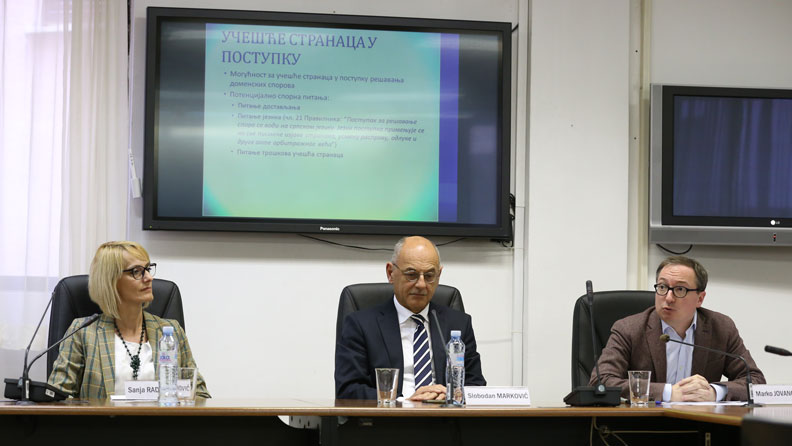 У другом делу скупа било је речи о пракси Комисије за решавање спорова поводом регистрације назива националних интернет домена Србије у претходној години, о чему је говорила проф. др Сања Радовановић, ванредни професор Правног факултета Универзитета у Новом Саду. Она је навела да је прошле године пред Комисијом вођено пет спорова, а након тога објаснила услове за усвајање тужбе пред Комисијом. Доц. др Марко Јовановић, доцент Правног факултета Универзитета у Београду, говорио је о појединим спорним процесноправним питањима у поступку решавања доменских спорова са фокусом на учешће странаца у поступку решавања доменских спорова и на однос поступака пред Комисијом и пред судом. Разговор је водио проф. др Слободан М. Марковић, редовни професор Правног факултета Универзитета у Београду.