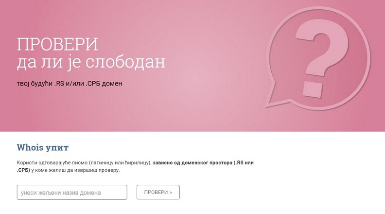 Провера расположивости назива домена доступна је на адреси domen.rs/whois, где се једноставним уписивањем било ког текста, свеједно да ли је на ћирилици или латиници, добија прави одговор. Ако је текст уписан у складу са правилима именовања .RS и .СРБ домена, корисник добија резултат у свих пет доменских простора одједном - .RS, .CO.RS, .ORG.RS, .EDU.RS и .IN.RS, или .СРБ, .ПР.СРБ, .ОРГ.СРБ, .ОБР.СРБ и .ОД.СРБ, зависно од одабраног писма. Ако је уписани текст мимо правила, као одговор стиже линк на објашњење са техничким захтевима како мора да гласи назив домена. Ако је тражени назив домена исправан али заузет, корисник може да види информацију ко је регистрант тог назива. А ако је тражени назив домена исправан и слободан, корисник добија линк ка листи овлашћених регистара .RS и .СРБ домена.