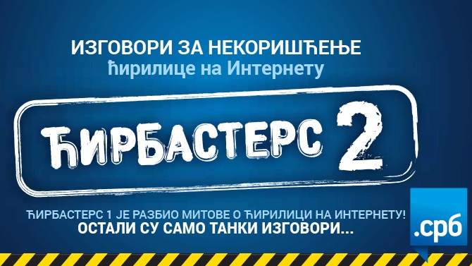 Пета година постојања ћириличког националног интернет домена .СРБ биће обележена у духу наставка прошлогодишњег концепта названог „Ћирбастерс“, који је био посвећен разбијању погрешних митова о ћирилици на Интернету. Ове године се „Ћирбастерс 2“ бави изговорима за некоришћење ћирилице на Интернету, а тим поводом Фондација "Регистар националног интернет домена Србије" (РНИДС) организује панел дискусију 27. јануара, у „Стартит центру”, Савска 5, Београд, од 12.00 до 14.00.