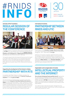 Issue 30 of the RNIDS News corporate newsletter brings an overview of events at RNIDS and in the local and global Internet community in the last quarter of 2016. The keynote event was the regular session of the Conference of Co-founders, at which new General Terms and Conditions for the Registration of National Internet Domain Names were approved.