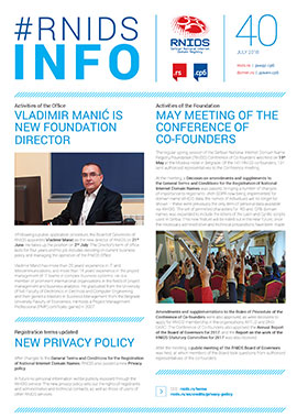 Issue 40 of the RNIDS Info corporate newsletter brings an overview of events at RNIDS and in the local and global Internet community during the second quarter of 2018. A new Foundation director was appointed – Vladimir Manić – and the regular May meeting of the Conference of Cofounders was held.