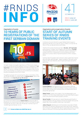 Issue 41 of the RNIDS Info corporate newsletter brings an overview of events at RNIDS and in the local and global Internet community during the third quarter of 2018. The 10th anniversary was marked of the commencement of public registrations in the .RS domain, and the autumn series of RNIDS training events began.