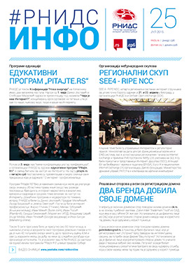 Issue 25 of the RNIDS INFO internal newsletter brings an overview of events at RNIDS and in the local and global Internet community in the second quarter of 2015. Two major events marked this quarter: the “Pitajte.RS” educational program held on Kopaonik and the international SEE4 ‑ RIPE NCC, organized in Belgrade. Statistics about the registration of .RS and .СРБ domains from April to June 2015 are available, as well as the news about the resolution of two domain name registration disputes and the information about the new Whois service at domen.rs/whois and the list of accredited registrars available at: domen.rs/registry. A regular session of the RNIDS Conference of Co‑founders was held while the activities on supporting the RSNOG community were continued. RNIDS also helped in the organization of the “Intellectual Property and the Internet” Conference, which was held at the Faculty of Law in Belgrade. The RNIDS office has submitted a three‑year report to the Ministry of Trade, Tourism and Telecommunications as part of the 2010 Cooperation Agreement. Within the international activities in this quarter, RNIDS representative participated in numerous global and European events. DOWNLOAD: RNIDS INFO No 25 (PDF 1.39 MB)