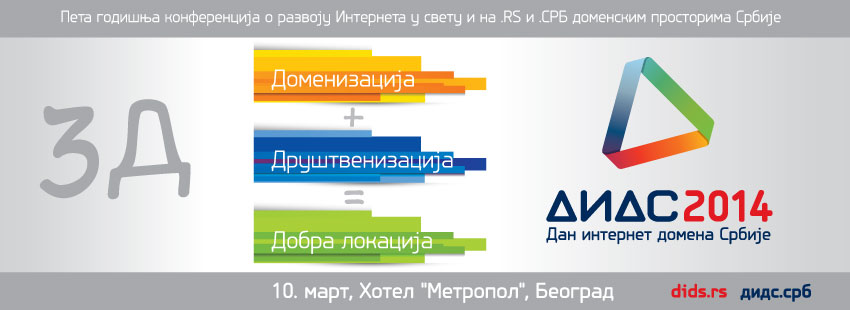 Ovogodišnji "Dan internet domena Srbije" održava se 10. marta, u Hotelu "Metropol", u Beogradu, u organizaciji Registra nacionalnog internet domena Srbije (RNIDS). Peta godišnja konferencija o razvoju Interneta u svetu i na .RS i .СРБ domenskim prostorima Srbije - DIDS 2014. ujedno obeležava i šest godina od početka rada nacionalnog .RS domena.
