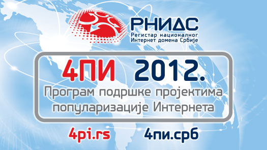Registar nacionalnog internet domena Srbije (RNIDS) dodelio je 21. decembra po treći put bespovratna sredstva u okviru Programa podrške projektima popularizacije Interneta za 2012. godinu (skraćeno: 4PI 2012). Ove godine pomoć RNIDS-a dobilo je osam internet projekata, koji će biti realizovani na jednom od dva nacionalna internet domena (.СРБ ili .RS). Dobitnicima su dodeljena sredstva u ukupnom iznosu od 4.000.000 dinara, a rok za završetak projekata je 31. jul 2013.
